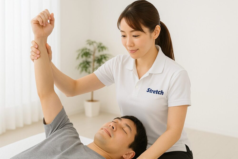 ドクターストレッチの施術では、トレーナーが利用者の体を直接サポートしながらストレッチを行います。